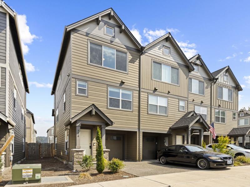 Welcome to this beautifully designed 3-story townhome offering both comfort and flexibility. The upper level features two spacious bedrooms and two full bathrooms, while the ground level provides a versatile studio/bedroom with its own full bath and private access through the garage and backyard, perfect for guests, a home office, or multi-generational living.Enjoy soaring 9-foot ceilings in the kitchen and living room, an electric fireplace for cozy evenings, A/C for year-round comfort, window blinds, and a fully fenced backyard ready for outdoor living.Ideally located near shops, restaurants, Troutdale Station food carts, and McMenamins Edgefield, this home blends modern convenience with a vibrant lifestyle. Come see it today!