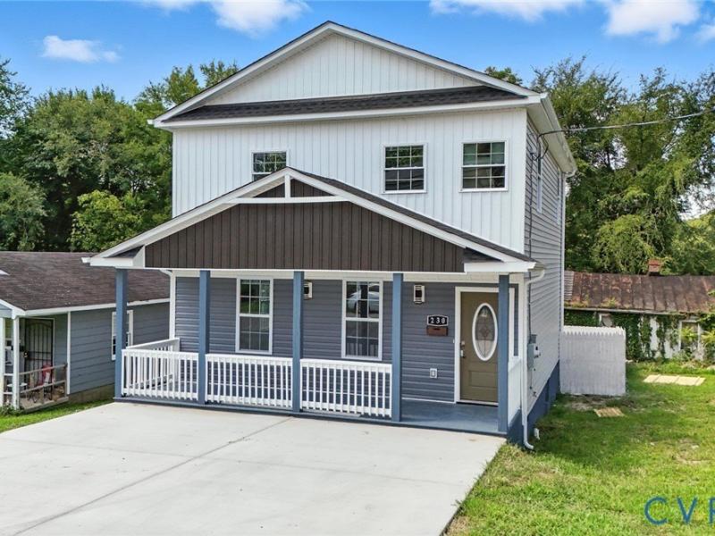 Step into modern elegance with this stunning brand-new construction offering 4 bedrooms and 3 full baths, including a primary suite on the first floor and a secondary suite on the upper level for ultimate comfort and flexibility. Spanning approximately 1,536 sq ft, this home showcases a bright open-concept design filled with natural light, luxury vinyl plank flooring, and recessed lighting throughout. The gourmet kitchen is a true showpiece-featuring white shaker cabinetry, quartz-style countertops, marble-patterned backsplash, stainless-steel appliances, a large center island, and modern matte-black fixtures. The living room offers a decorative electric fireplace with custom tile surround and accent lighting, creating an inviting focal point for entertaining or relaxing. Each bathroom is elegantly finished with designer porcelain tile, black hardware, and built-in niche shelving. The primary suite provides a serene retreat with a spacious layout and spa-inspired ensuite. Enjoy outdoor living with a covered rear deck, private fenced backyard, and ample driveway parking. Located minutes from downtown Petersburg, local shops, dining, and major highways, this residence perfectly combines quality, comfort, and style.