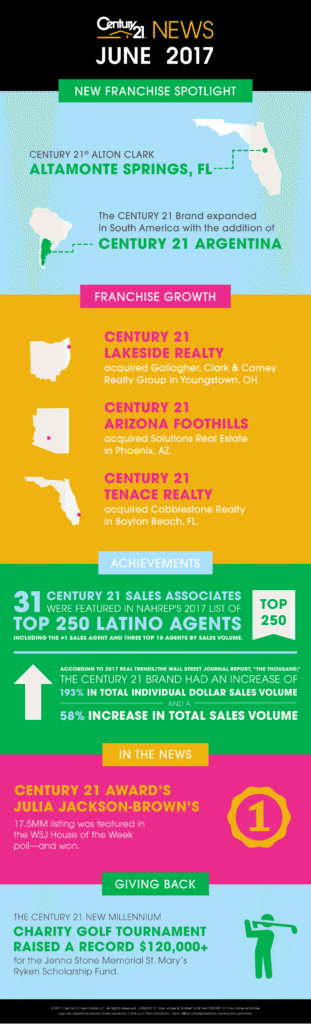 The 2017 REAL Trends/The Wall Street Journal Report “The Thousand” was released in June. According to the report, the CENTURY 21 Brand had an increase of 193% in total individual dollar sales volume and a 58% increase in total sales volume (including team volume), highlighted by two agents in the top 20 for individual sales — Gina Gargeu, CENTURY 21 Downtown (8) and Gerri Andolina, CENTURY 21 Winklhofer (20). We also had two agents in the top 20 by average sales price — Geneva Brett, CENTURY 21 M&M and Associates (9) and Ellen Elman, CENTURY 21 Metropolitan (15). View the rankings here.