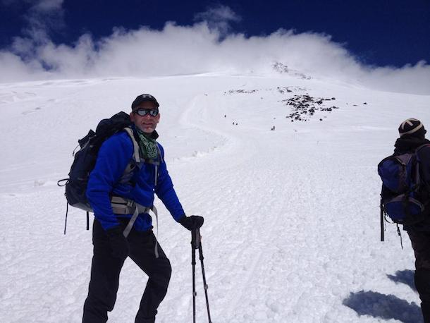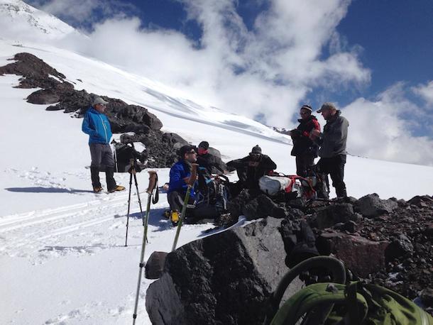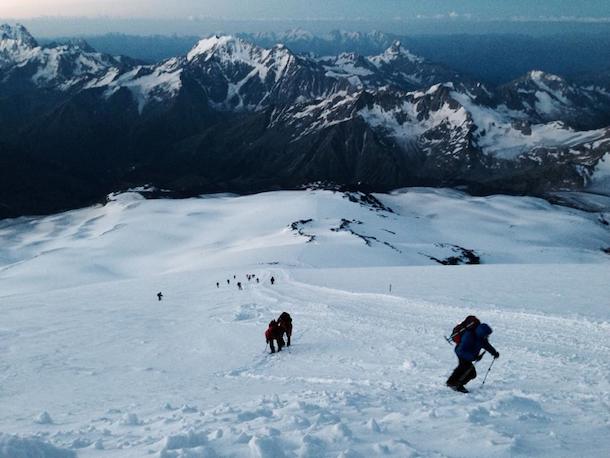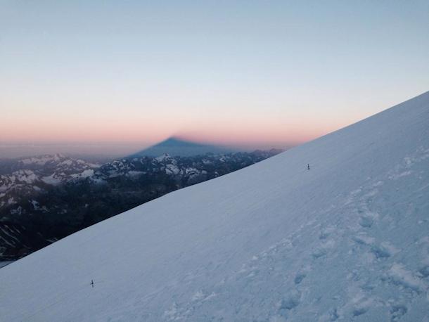In this photo below you will see a large pyramid shadow casting into the distance. This was the shadow of Mt. Elbrus as the sun rose around 5:30 am. Rick explained, “This is a spectacular sight and a rarity. In all my years of climbing I have only seen this phenomenon one other time from the summit of Mt. Hood.”